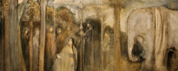 Arthur’s artistic motivation is in the “honoring of imagination through the personification of nature. My pieces have serious and fantastical images of people, animals and spirits that are submerged into nature. They are things that people will immediately recognize. They are interesting yet unusual combinations, from floating spirits to ancient ceremonies to sea turtles gathered on a beach. They tend to combine in dreamlike ways.” |
