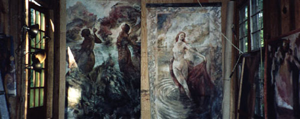 Arthur paints in a small studio imbued by nature, where birds nest in the rafters. When the studio is not large enough for the size of the canvas on which he loves to work, he moves outside to the trees and hangs the canvas from branches using a pulley system of his own invention. Arthur spends his days in faded overalls, transforming canvas into mystical wonderlands, influenced by the surrounding woods.
